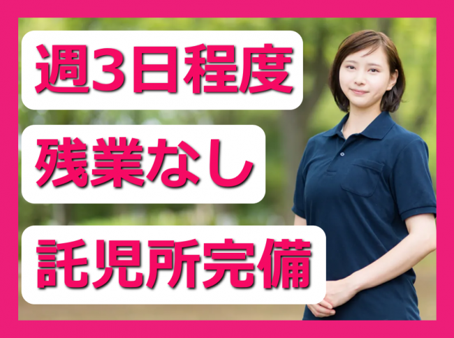 | 勤務時間 | 8:30~17:30 ※休憩時間:60分 ※時間外労働時間:なし ※週所定労働日数:週3日程度 |