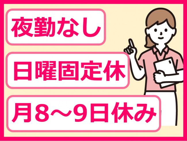 | 休日・休暇 | ・原則日曜日 ・シフト制のお仕事です ・月8~9日 ・年間休日107日 ・6か月経過後の年次有給休暇10日 |
