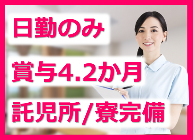 寮・託児所完備/賞与4.2ヶ月/日曜日を含む完全週休二日制/年間休日107日