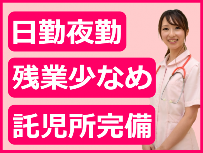 託児所完備/日勤・夜勤専従相談可/賞与4.4ヶ月/残業少なめ/年間休日109日/令和元年新設
