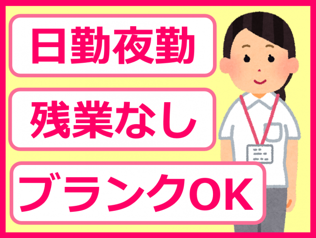 | 勤務時間 | ①8:30~17:00 ②10:15~18:45 ③8:00~16:30 ④16:30~9:00 《日勤のみ勤務の場合》就業時間①~③のシフト 《夜勤のみ勤務の場合》就業時間④ ※休憩時間:60分 ※時間外労働時間:なし ※年間休日数:112日 |