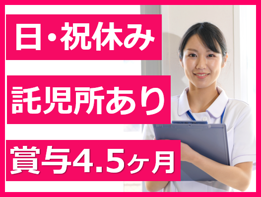 託児所完備/賞与4.5ヶ月/年間休日108日/残業少なめ/日勤のみ(夜勤なし)/職場見学可