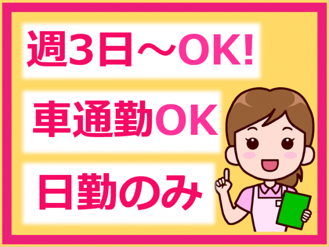 資格やデイサービスでの勤務経験のある方歓迎!週3日~OK!勤務日数相談可能!車通勤OK!