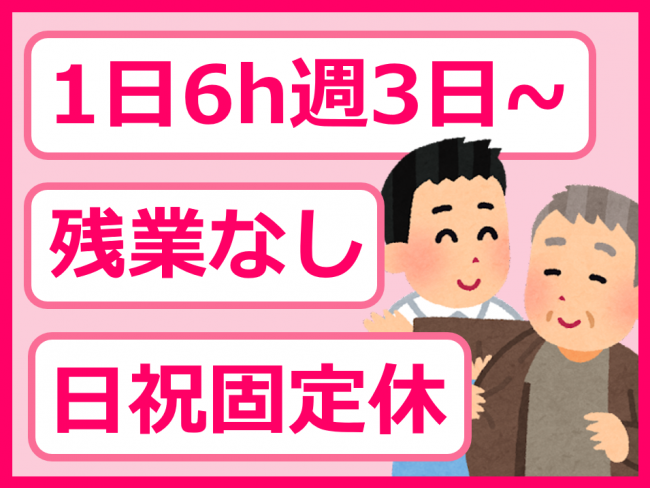 | 勤務時間 | ①9:00~16:00 ②8:15~17:15の間の7時間以上 ※休憩時間:60分 ※時間外労働時間:なし ※週所定労働日数:週3日~週5日 |
