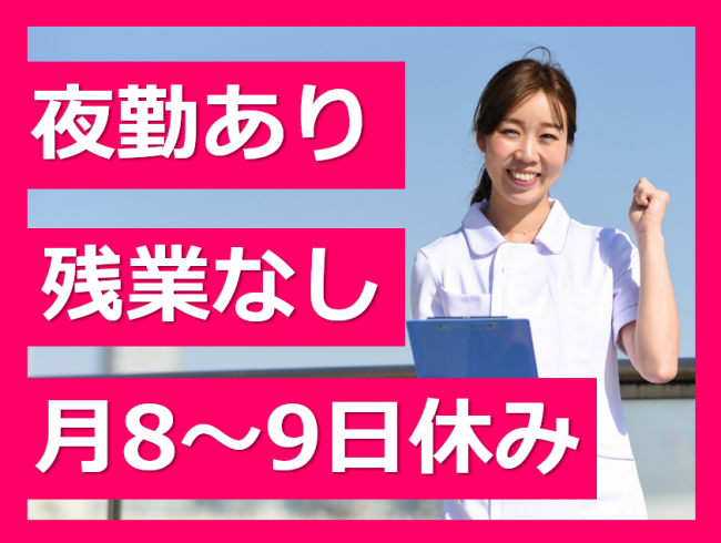| 勤務時間 | ①8:30~17:30 ②9:45~19:15 ③19:00~9:00 ※休憩時間:75分(③は120分) ※時間外労働時間:なし ※年間休日数:105日 |