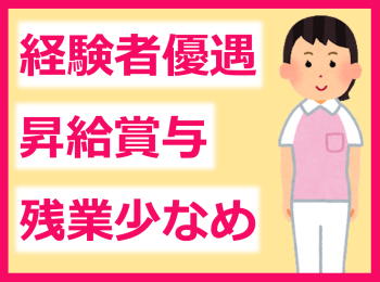 | 休日・休暇 | ・日、祝日、その他 ・シフト表により週休2日(土・日・祝)または(木土午後休・日・祝) ・年末年始休暇 ・8/15 ・年間休日97日 ・6か月経過後の年次有給休暇10日 |