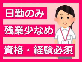 | 勤務時間 | ①7:00~16:00 ②9:00~18:00 ③10:00~19:00 ④16:30~9:30 ※休憩時間:60分 ※時間外労働時間:月平均5時間 ※年間休日数:110日 |