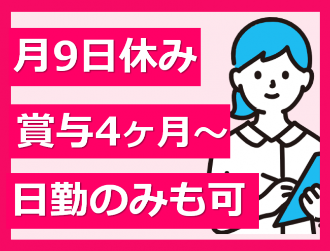 | 休日・休暇 | ・その他 ・月9日(2月は8日) ・業務計画表による ・年間休日108日 ・6か月経過後の年次有給休暇10日 |