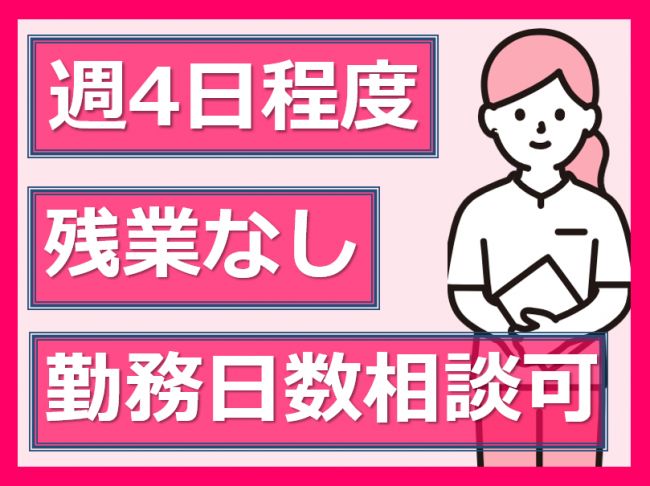 週4日程度/残業なし/日曜固定休み/勤務日数相談OK/お盆・年末年始休み/下祇園駅から徒歩圏内