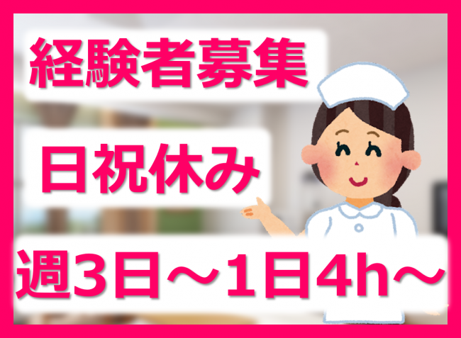 | 求める人材 | 〇学歴 ・不問 〇必要な経験・スキル ・准看護師業務経験:必須 〇必要な免許・資格 ・准看護師:必須 ・普通自動車運転免許:必須(AT限定可) |