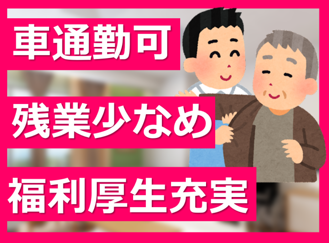 | 求める人材 | 〇学歴 ・高校以上:必須 〇必要な経験・スキル ・不問 〇必要な免許・資格 ・介護福祉士:あれば尚可 ・普通自動車運転免許:必須(AT限定可) |