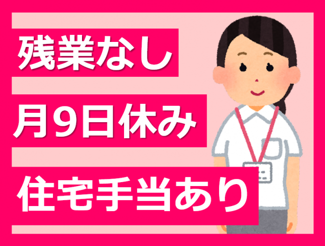 経験不問!残業なし/月9日休み/子育て世代も働きやすい環境/急な休みも対応/住宅手当あり