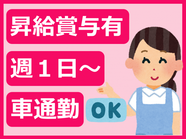 | 待遇 | 【給与補足】 〇定額的に支払われる手当 なし 〇固定残業代 なし 〇その他の手当等付記事項 ・介護職員処遇改善手当有 【待遇詳細】 ・賞与:あり ・昇給:あり ・通勤手当:実費支給(上限なし) ・マイカー通勤:可(駐車場あり) ・転勤の可能性:なし ・受動喫煙対策:あり(屋内禁煙、屋外に喫煙スペースあり) ・雇用期間:定めなし ・試用期間:3か月(試用期間中の労働条件:同条件。短縮する場合もあり) ・加入保険:労災保険(就業時間・日数により雇用保険・社会保険加入) ・定年制:あり(一律66歳) ・再雇用制度:あり ・育児休業取得実績:あり ※正社員登用あり |