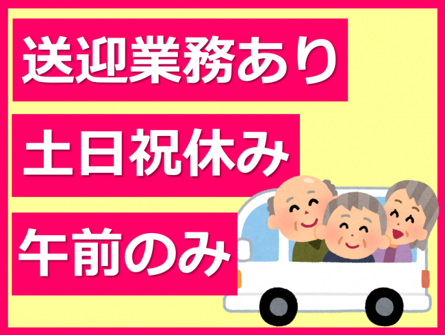 介護福祉士歓迎/運転経験ある方歓迎/午前のみ/残業なし/賞与あり/勤務日相談OK/駅から徒歩5分