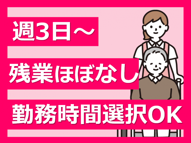 | 勤務時間 | ①7:00~15:30 ②8:30~17:00 ③10:00~18:30 ※①~③選択可 ※休憩時間:60分 ※時間外労働時間:月平均5時間 ※週所定労働日数:週3日~週5日 |