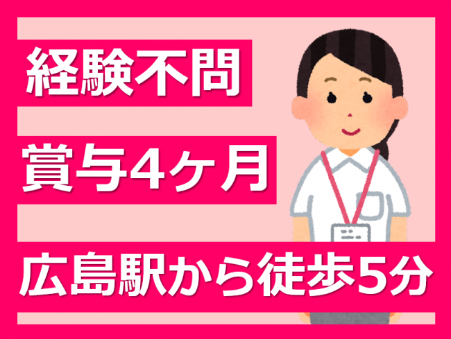 | アクセス | 〇最寄駅 ・JR「広島(北口)駅」から徒歩5分でアクセス便利です! ※交通費支給! ※車通勤OK!バイク通勤OK! ※駅近5分以内! |