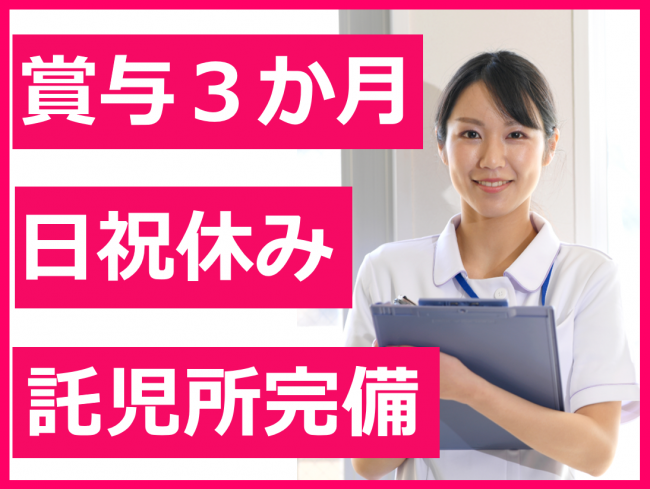 託児所完備/日・祝日固定休/盆・年末年始休み/賞与3カ月/働きやすい職場づくりに取り組んでいます
