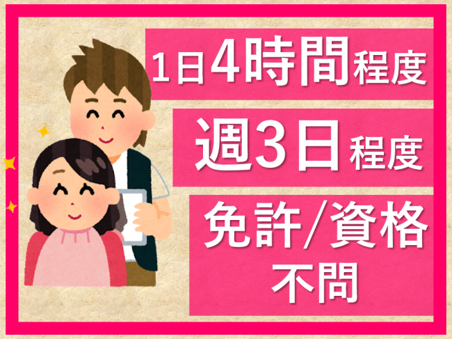 | 勤務時間 | 8:30~19:00の間の4時間程度 ※休憩時間:就業時間が6時間を超えた場合、休憩時間は法定付与となります ※時間外労働時間:なし ※週所定労働日数:週3日程度 |