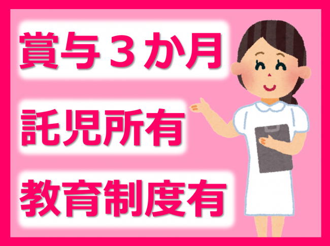 託児所完備/残業月5時間/賞与3カ月/福利厚生充実/充実した教育制度あり!職員の成長をサポート!