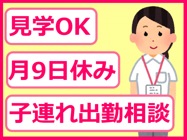 未経験でも応募可/月9日休み/昇給賞与あり/子連れ出勤相談OK/無理なく働ける環境を整えています/見学OK