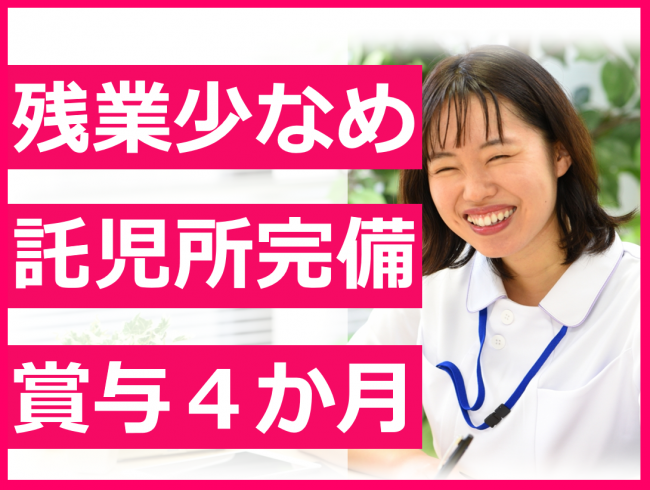 託児所完備(0~2歳児)/年間休日120日/残業月5時間/賞与4カ月/週休2日制/バス停の目の前