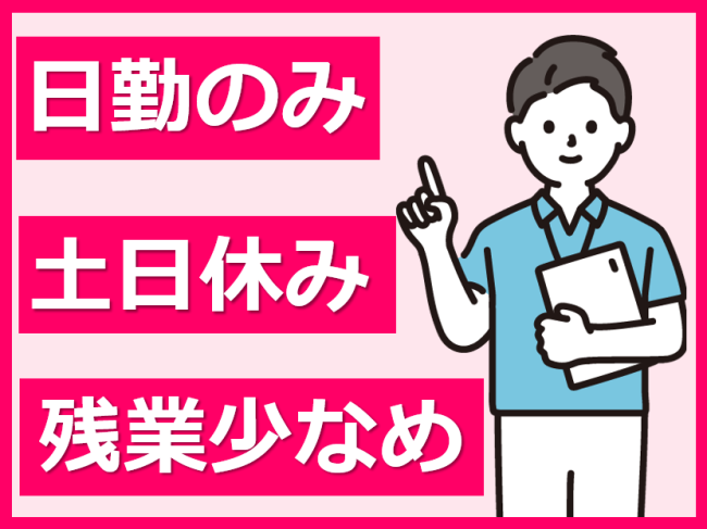 | 勤務時間 | ①7:30~16:30 ②8:00~17:00 ③8:45~17:45 ※休憩時間:60分 ※時間外労働時間:月平均5時間 ※年間休日数:107日 |