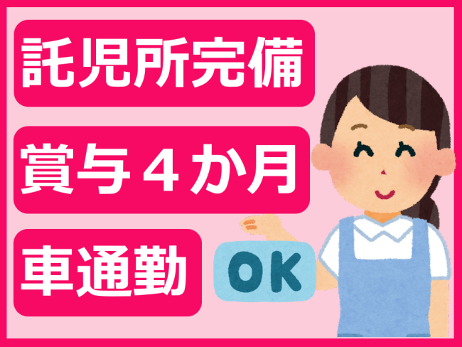 託児所完備(~3歳)/介護経験者歓迎/年間休日126日/残業かなり少なめ/祝日固定休/賞与4カ月