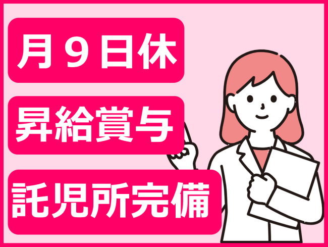 託児所完備!子育て世代を応援/摂食などに長けている方歓迎/残業少なめ/月9日休み/賞与3.5カ月