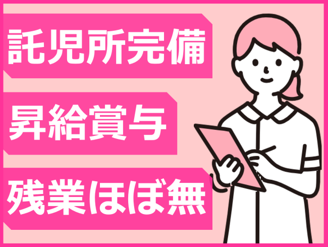 24時間託児所完備/残業ほぼなし/年間休日120日/週休2日制/賞与3.5カ月/子育て支援求人