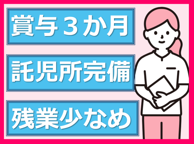 託児所完備!子育て世代を応援/残業少なめ/賞与3カ月/特別休暇が年3日あり/有休1時間単位OK