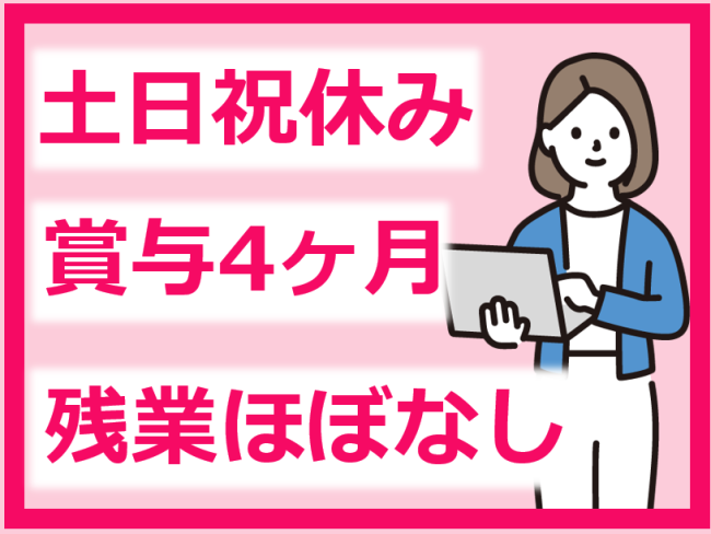 残業ほぼなし/土日固定休み/昇給あり/賞与4カ月/夏季・冬季休暇あり/車通勤OK