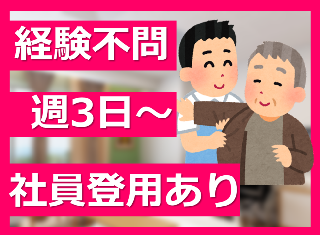 | 求める人材 | 〇学歴 ・不問 〇必要な経験・スキル ・経験不問 ・PCスキル:エクセル・ワードなどの入力程度は必要 〇必要な免許・資格 ・介護福祉士、介護職員初任者研修修了者(旧ホームヘルパー2級):あれば尚可 ・無資格の応募可能 ・普通自動車運転免許:あれば尚可(AT限定可) |
