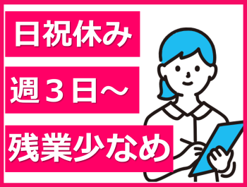 | 休日・休暇 | ・その他 ・法人カレンダーによる ・月9~10日休み ・年間休日110日 ・6か月経過後の年次有給休暇10日 |