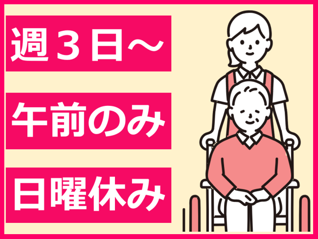 週3日~/1日4~5時間の午前のみ/土祝交替勤務できる方・介護福祉士歓迎/日曜固定休/昇給あり