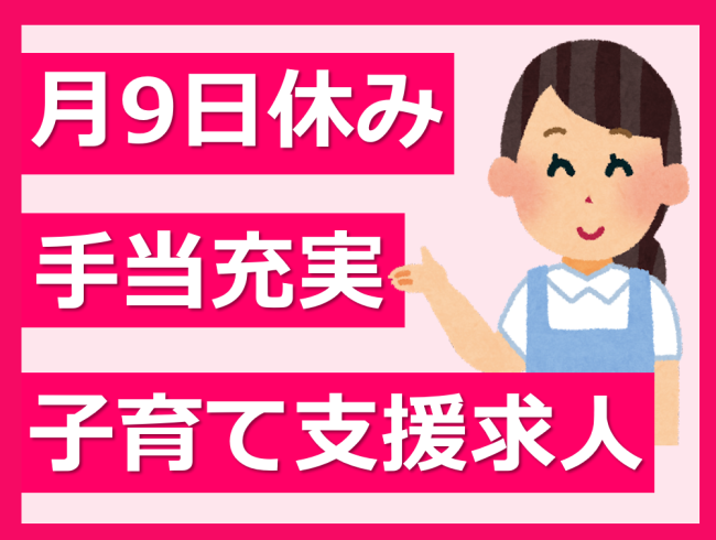 託児所完備(~2歳)/残業少なめ/月9日休/賞与3.8カ月/住宅手当など手当充実/子育て支援求人