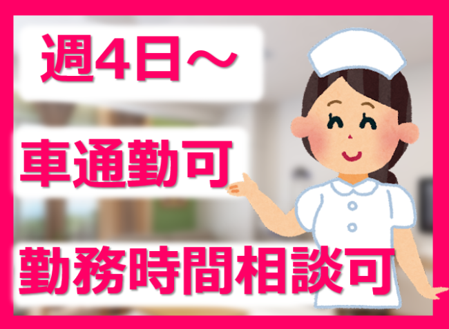 | 求める人材 | 〇学歴 ・不問 〇必要な経験・スキル ・経験:あれば尚可 ※ブランクがあっても大丈夫です 〇必要な免許・資格 ・看護師、准看護師:いずれか必須 |