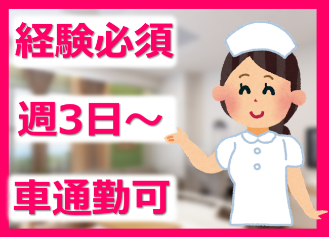 | 求める人材 | 〇学歴 ・不問 〇必要な経験・スキル ・看護経験1年以上:必須 〇必要な免許・資格 ・看護師、准看護師:いずれか必須 |