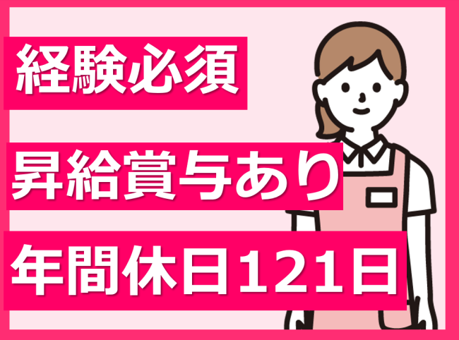経験があれば無資格可/年間休日121日/残業月2時間/賞与3.75カ月/最初は日勤からのスタート