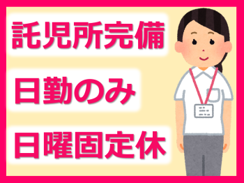 | 休日・休暇 | ・日曜、祝日、その他 ・月8~9日休み ・休み希望はシフトで調整いたします ・土曜日は不定休のため出勤になる場合もあり ・年間休日107日 ・6か月経過後の年次有給休暇10日 |